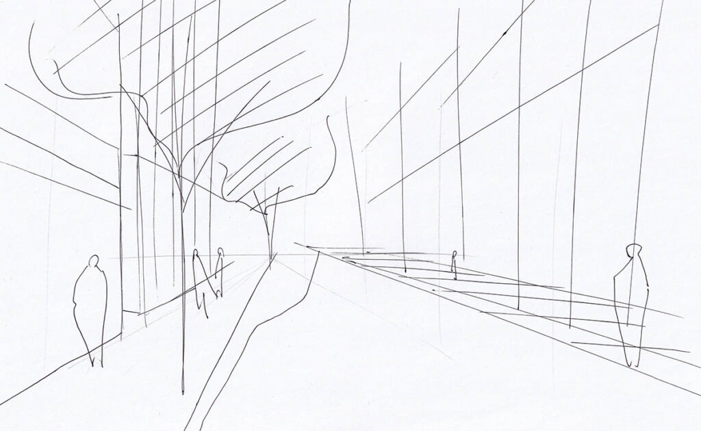 こちらのように、適宜、参考イメージや落書きで描いたような添景(人、樹木、車等)を入れていただくとイメージがより伝わります。スケッチはPCやipadでのデジタルツールを活用しても、印刷してペンで直書きでも、どちらでも問題ございません。伝われば何でもOKです。