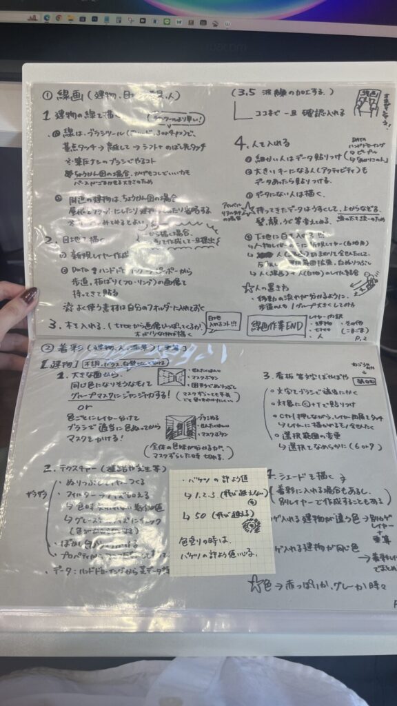 人物だけは描くことが得意だったのですが、パースの知識は乏しく、レイヤー数の多い絵を描くのも初めてで勉強の毎日でした。休日の土日で勉強したり、こっそり仕事を進めたり、パースの本を読んでみるけど実践してないからわからなかったり、だから先輩にオンライン勉強会してもらってパースのいろは教わったり(びっちり4時間、先輩大感謝、、!)とにかくメモメモメモ!の日々でした。