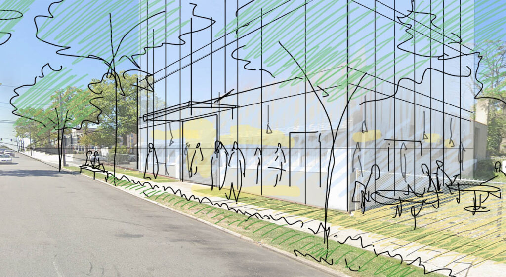 こちらのように、適宜、参考イメージや落書きで描いたような添景(人、樹木、車等)を入れていただくとイメージがより伝わります。スケッチはPCやipadでのデジタルツールを活用しても、印刷してペンで直書きでも、どちらでも問題ございません。伝われば何でもOKです。