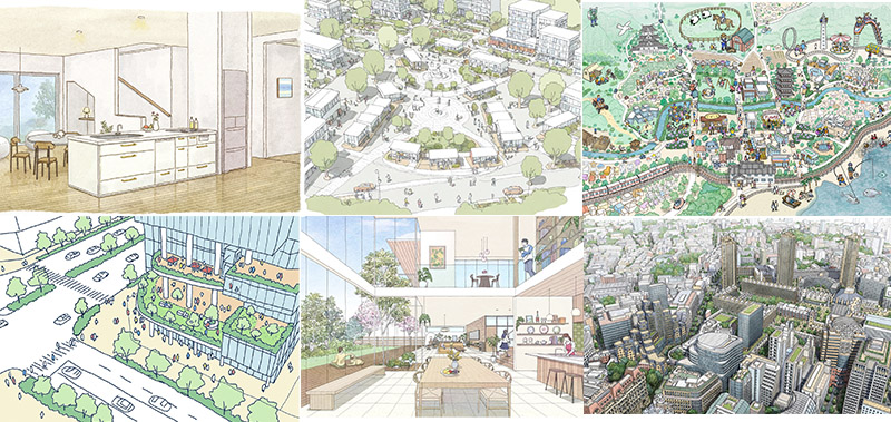 鉛筆やペン、マーカー、水彩などの画材を使い、建物や空間の完成イメージを表現します。