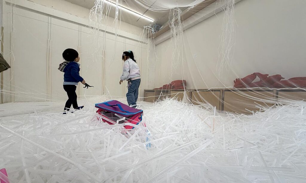 普段は飲むために使うストローを、つなげたり、帽子を作ったりと、