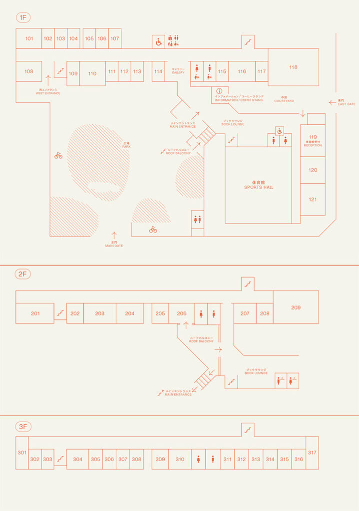 校舎棟の1階は、飲食や物販などのお店を中心に、シェアキッチンや配信スタジオ、ギャラリーなどもある、いつ来ても楽しいエリアです。2階にはコワーキングスペースとこども向けのクリエイティブラーニングスクール、3階はオフィスが入居し、さまざまな人たちが働いたり、学んだりしています。