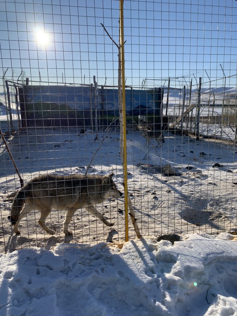 その代わりなのか、ガイドさんのご厚意で動物園に連れて行ってくれました。 その動物園は道のそばにあり、動物を檻で囲っただけのサービスエリアのような場所でした。中には大きな熊や10数匹のオオカミ、ボブキャット、モンゴル犬などがいました。熊は生まれた頃からこの動物園で飼育されているらしく、係の方がミルクを入れた2Lペットボトルを檻に入れると、器用に口で蓋を開けて飲んでいました。驚きです。