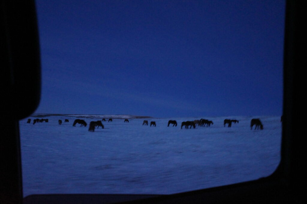この日は猟師さんに協力してもらいながらオオカミを探す予定でしたが、その頃には日が暮れて暗くなってしまったため、近場のホスタイ国立公園という野生の馬や鹿を見ることができる有名な観光スポットに急遽行くことになりました。 時間は短かったですが、野生動物たちを見ることができましたし、青くなっていく景色に浮かぶ動物のシルエットがとても綺麗でした。