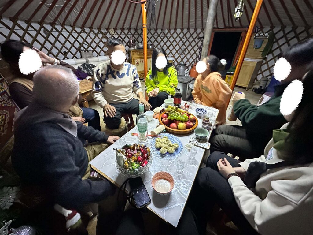 その後、3時間ほど車に揺られたところにあるテレルジという地域に移動して遊牧民の家に泊まりました。この日は12月31日、大晦日だったので、道中で買ったケーキやフルーツを食べながら年越しの瞬間を迎えました。