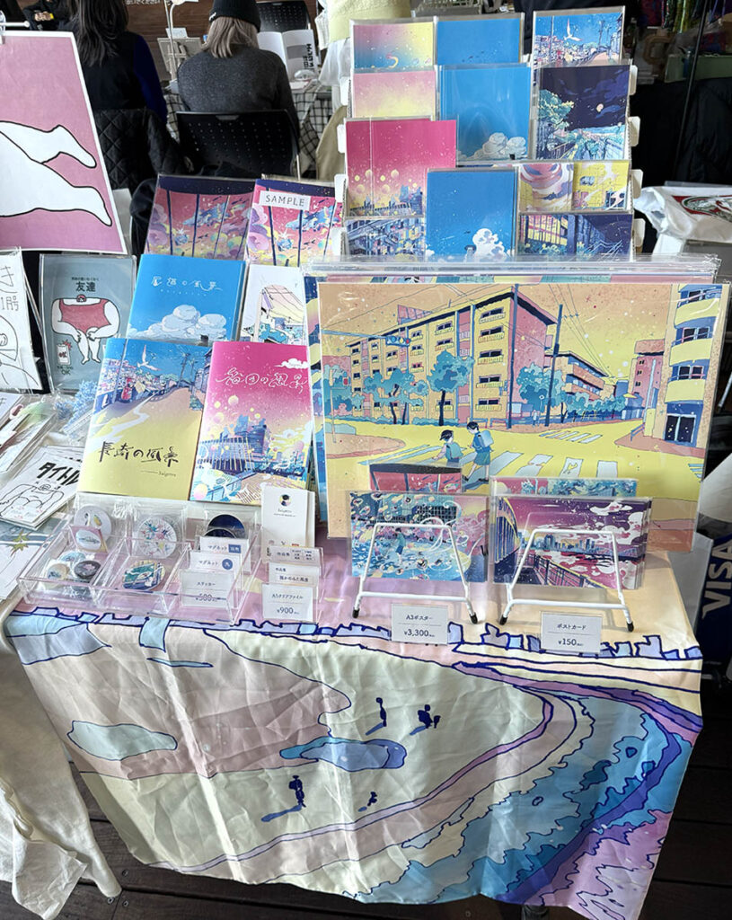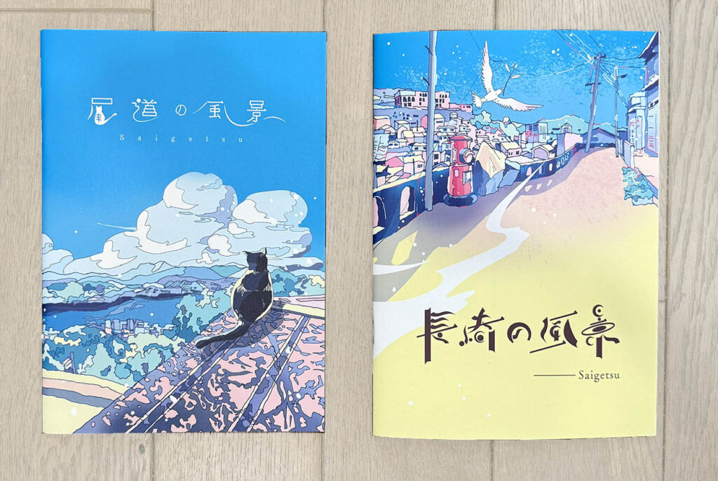 Saigetsuさんは美しい配色と柔らかい線が特徴的で、実際に歩いて、街ごとにイラスト作品集をつくっています。最初の頃の方はトレースで形を取っていたそうなのですが、かたい絵になってしまうことを感じ、今ではトレース無しでのゆるゆる線をメインにしているそう。確かにその自由な線がまた絵の魅力をあげているように感じました。子どものころに昔見たような世界が広がります。