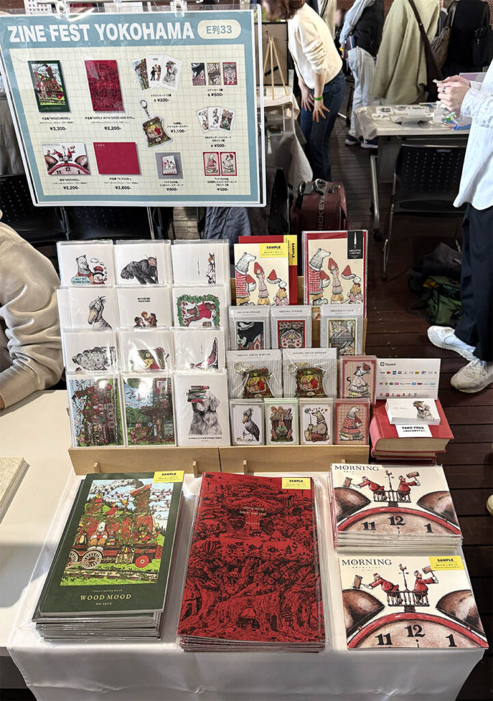 kei saitoさんのブースでは、ファンタジーな世界観と緻密なイラスト集の表紙の描き込みに目を奪われ、「このモチーフの選び方と描き込み量は何か自分に通ずるものがある、、、。と」立ち止まりました。